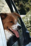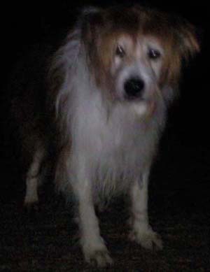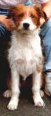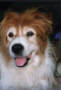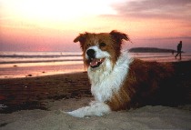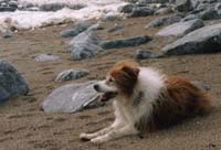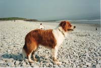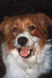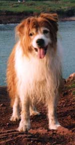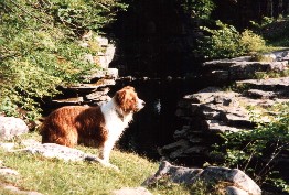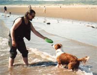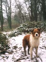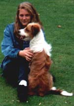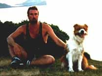 Jules started life in January 1991 as the only brown and white pup in a litter. Bred from a collie sheepdog and a small long haired terrier, he was originally my girlfriend Celia's dog. When he was 2 years old, she asked me to take him on permanently, mainly due to my outdoor lifestyle. Jules was never formally trained and didn't know the meaning of the word 'sit'. But, over the years, he became a very obedient dog, and never needed a lead. Pictured right with Celia, his first owner. |